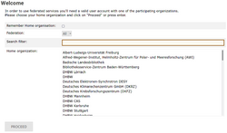 # Select your home organization from the list on the main page and click '''Proceed''' or '''Fortfahren'''. |